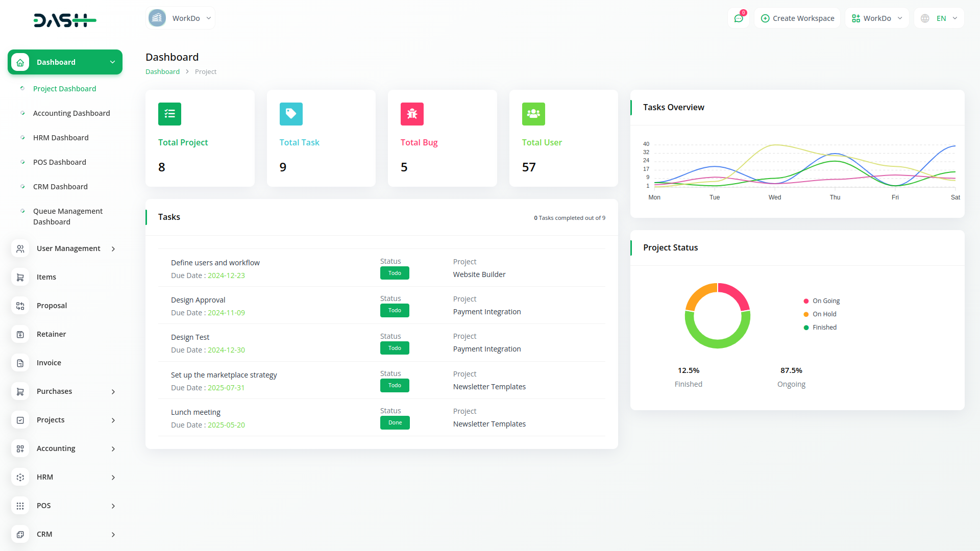 Get an overview of the total number of projects, tasks, bugs, and members. A visual representation of the task overview and project status can help you estimate the progress on each task. Lastly, you can check the top due task.